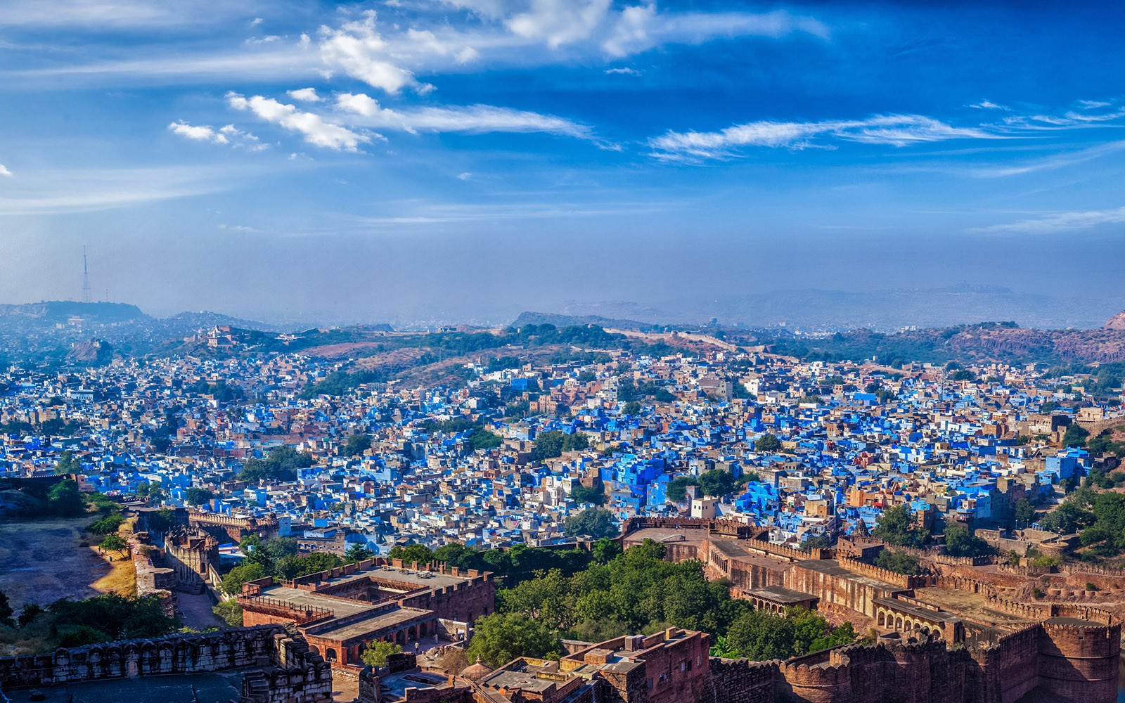 Entdecken Sie an einem ganzen Tag Jodhpur: Hier erwarten Sie beeindruckende Architektur und die lebendige Kultur der „Blauen Stadt“. Umgeben von einer beeindruckenden 10 km langen Mauer, wurde sie etwa ein Jahrhundert nach der Stadtgründung errichtet. Besuchen Sie das majestätische Mehrangarh Fort, auch bekannt als „Zitadelle der Sonne“, und werfen Sie einen Blick in die faszinierende Vergangenheit Jodhpurs. Nördlich des Forts liegt Jaswant Thanda, ein Marmordenkmal mit kunstvollen Säulen, das zu Ehren des Herrschers Jaswant Singh II erbaut wurde.