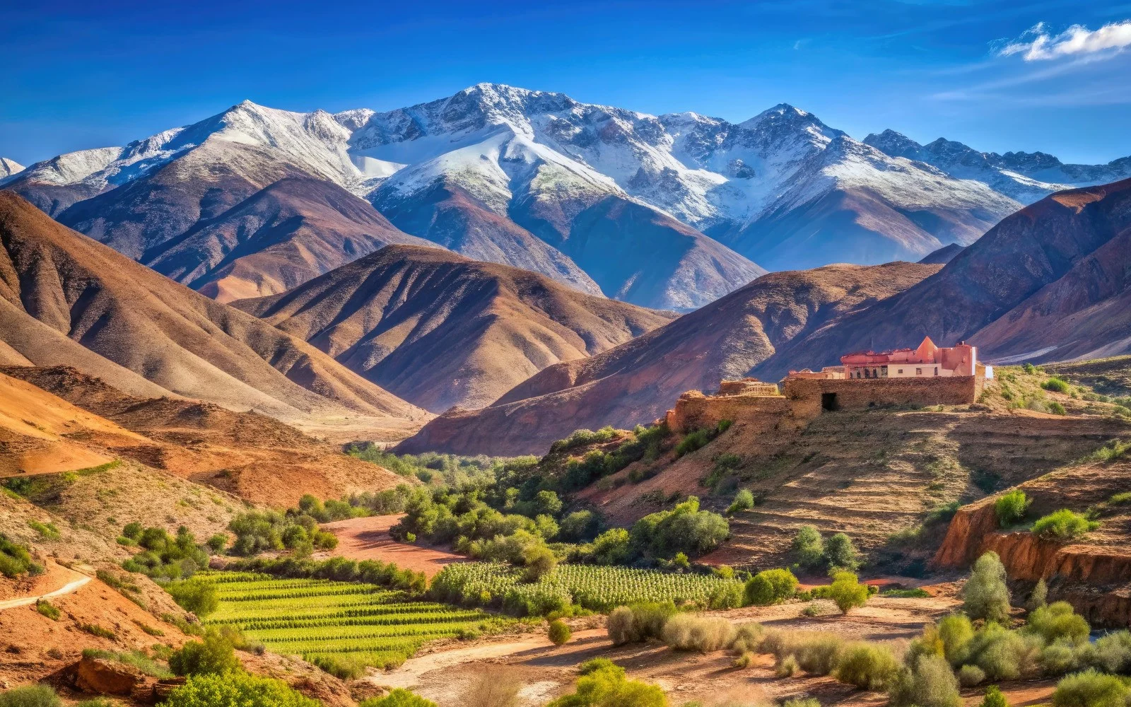 Fahrt durch die beeindruckenden Naturlandschaften des Mittleren Atlas nach Ifrane. Dieser beliebte Erholungsort fasziniert durch seine einzigartige Architektur. Die Reise führt Sie weiter entlang malerischer Berge und durch das Agraranbaugebiet von Beni Mellal bis nach Marrakesch, Marokkos schönster Königsstadt, die sich vor der majestätischen Kulisse des Hohen Atlas präsentiert. Am Abend lädt Ihre Reiseleitung Sie zu einem Abendessen in ein erstklassiges Restaurant der Stadt ein, wo Ihnen authentische marokkanische Spezialitäten serviert werden.