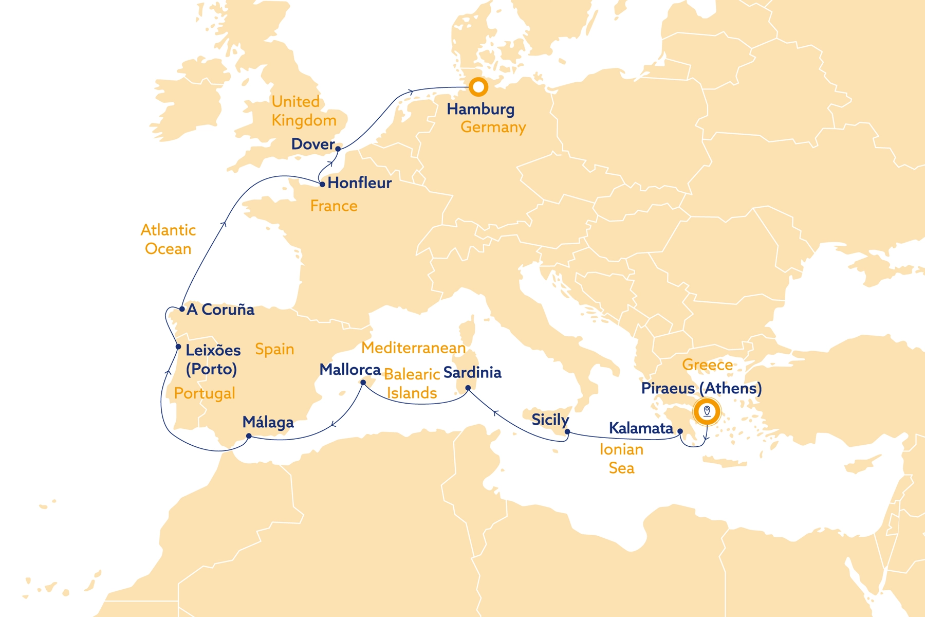 Griechenland – Peloponnes – Sizilien – Sardinien –Mallorca – Málaga – Porto – A Coruña – Honfleur – Dover – Deutschland